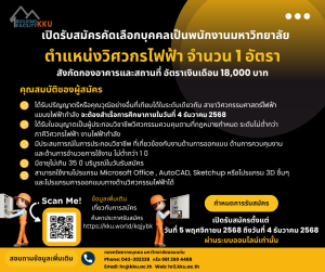 กองอาคารและสถานที่ มข. เปิดรับสมัครงาน! 📢กองอาคารและสถานที่ มข. 👨🔧เปิดรับสมัครงาน! ⚡ตำแหน่งวิศวกรไฟฟ้า 1 อัตรา💰 เงินเดือน 18,000 บาท ✅สำเร็จการศึกษาระดับปริญญาตรี หรือคุณวุฒิอื่นในสาขาวิศวกรรมศาสตร์ไฟฟ้ากำลัง✅ มีใบอนุญาตเป็นผู้ประกอบวิชาชีพวิศวกรรมควบคุม ระดับไม่ต่ำกว่าภาคีวิศวกรไฟฟ้า งานไฟฟ้ากำลัง✅มีประสบการณ์ด้านงานออกแบบ ควบคุมงาน หรือการใช้งานระบบไฟฟ้าอย่างน้อย 1 ปี✅อายุไม่เกิน 35 ปีบริบูรณ์ในวันรับสมัคร✅สามารถใช้โปรแกรม Microsoft Office, AutoCAD, SketchUp หรือโปรแกรมออกแบบด้านวิศวกรรมไฟฟ้าอื่น ๆที่เกี่ยวข้อง📅เปิดรับสมัครตั้งแต่5 พฤศจิกายน 2568 – 4 ธันวาคม 2568🌎สมัครออนไลน์เท่านั้น https://kku.world/kqjybk☎️สอบถามเพิ่มเติม043-202338 / 081-260-4488hr@kku.ac.th สนับสนุนการเรียนการสอน สนับสนุนกิจกรรมต่าง ๆ ที่ดำเนินการภายในมหาวิทยาลัยขอนแก่น โดยการบริหารจัดการ พัฒนาปรับปรุงระบบ จัดทำแผนการดำเนินงานตามภารกิจที่ได้รับมอบหมายให้บรรลุวัตถุประสงค์ของมหาวิทยาลัยขอนแก่น Facebook-f Instagram Twitter Linkedin-in บริการ หน้าหลัก เกี่ยวกับเรา บริการ เอกสารเผยแพร่ ตำแหน่งงาน ติดต่อเรา